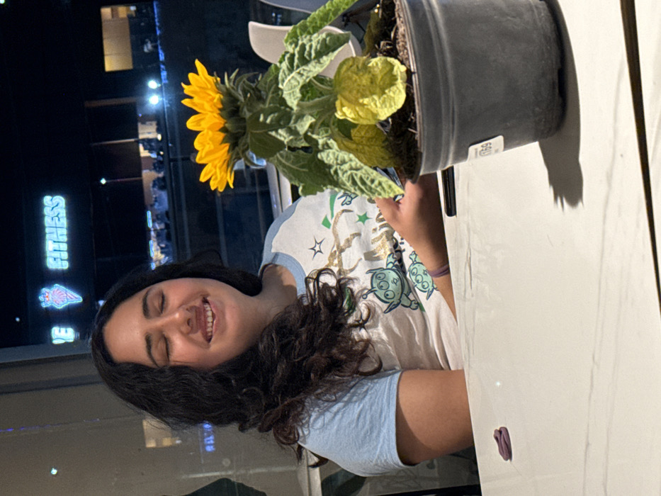 A woman smiles, holding a potted sunflower. The flower has a single, vibrant yellow bloom and green leaves. She wears a t-shirt with light blue sleeves and cartoon designs. In the background, a fitness center sign is visible, illuminated with neon lights. The scene appears to be outdoors at night, possibly on a balcony or patio. A white, textured surface is to the right.