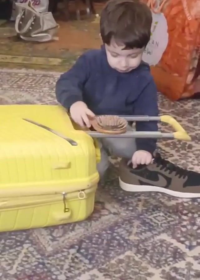 A young child sits on a patterned rug next to a bright yellow suitcase, using a hairbrush to clean a black and brown sneaker. The child wears a dark blue long-sleeved shirt and light-colored pants. The suitcase has a yellow handle extended. In the background, there are shopping bags and other items.