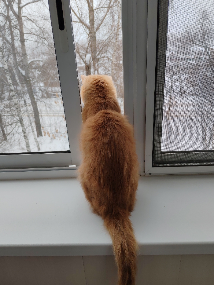 An orange domestic cat is observed from the rear, sitting upright on a white window sill and looking out a window. The cat's tail hangs downwards towards the right side of the frame. The window assembly consists of two distinct sections: the left section features a white-framed glass pane that is partially open, tilted inwards from the top; the right section features a white-framed window fitted with a dark mesh screen. The exterior environment visible through the window displays a snow-covered landscape with numerous bare deciduous trees under an overcast sky. The scene is located within a structure in the city of Unknown, Unknown.