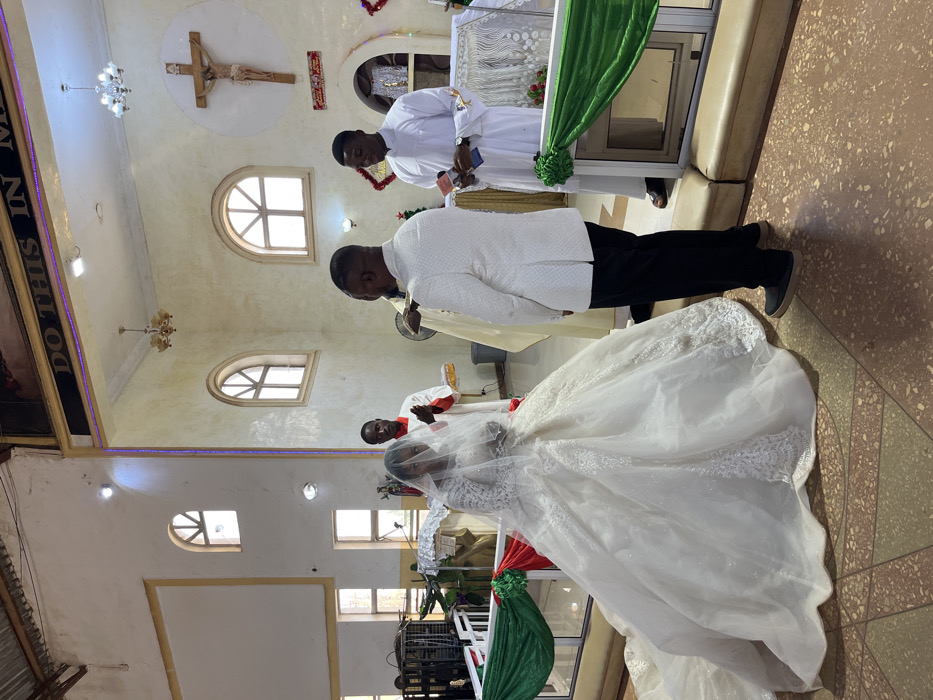 An indoor scene within a church in Kuru Karama, Nigeria, depicts a wedding ceremony in progress