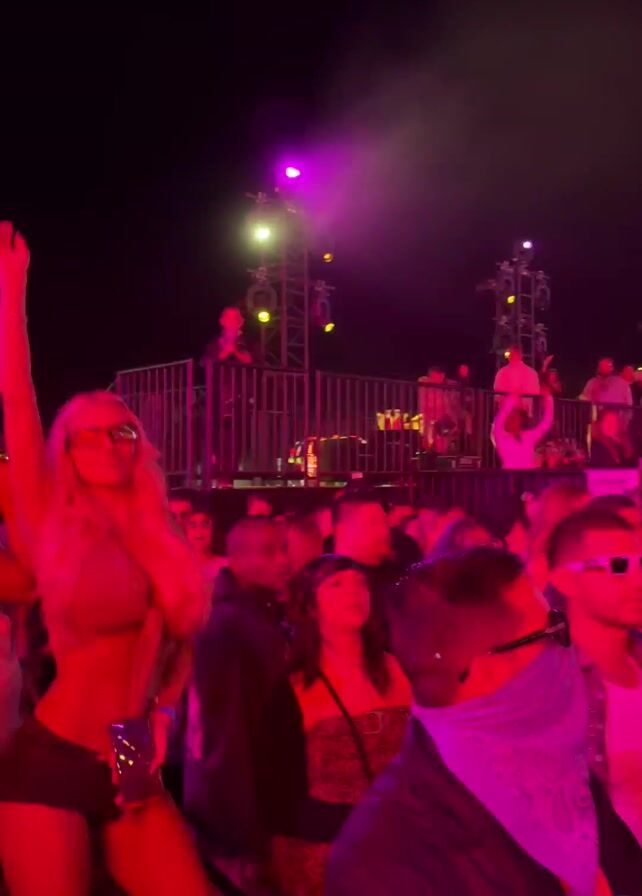 crowd of people at an outdoor concert at night. Many people are looking towards a stage with metal scaffolding and lighting. A few people are on the stage. A woman with long blonde hair, sunglasses, a tan bikini top and short shorts is visible in the front, dancing with her arm raised. Several people in the crowd wear sunglasses, hats or bandanas. The lighting changes colors from white to pink to red.
