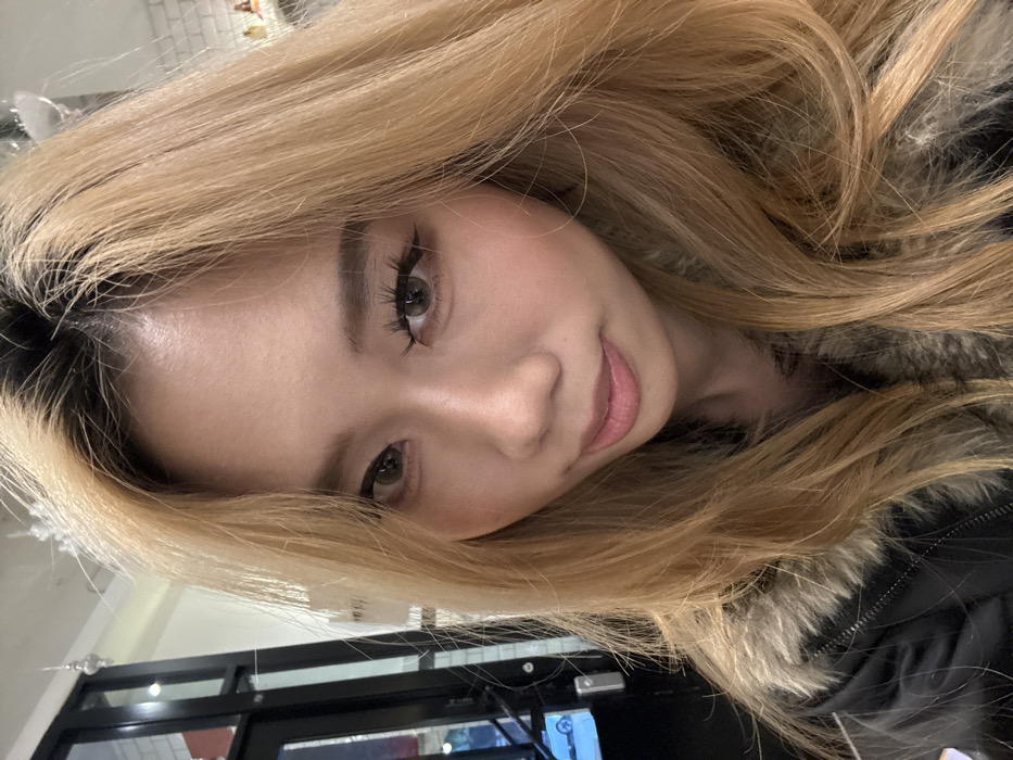 The image features a close-up portrait of an East Asian female. She has long, wavy, light blonde hair with visible dark roots. Her eyes appear light brown or grey, enhanced with eyeliner and prominent eyelashes. She wears a light pink lip tint and visible blush on her cheeks. She is clad in a black jacket featuring a distinct light-colored faux fur collar. The subject looks directly towards the camera with a neutral to slightly smiling expression. The background indicates an indoor setting. To the left, a dark-framed glass door is visible, through which faint reflections and external lights suggest an evening or night scene. Adjacent to the door is a section of white-tiled or brick-patterned wall. The background to the right is blurred, showing a lighter-toned wall and indistinct decorative elements overhead, possibly a white dangling ornament. No specific identifiers within the image confirm the location as Longta, China.