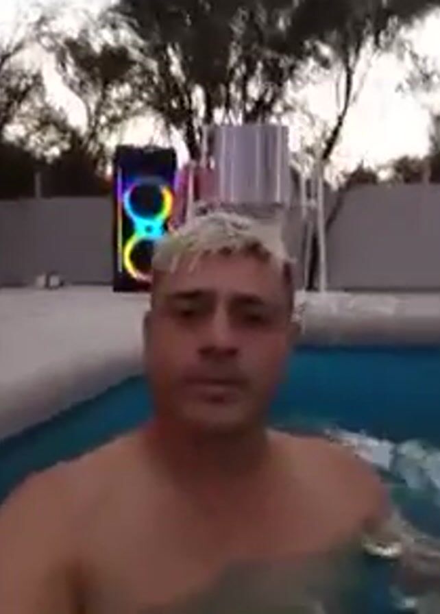 shirtless man in a swimming pool. He has short, bleached-blond hair. Behind him is a large, portable speaker with colorful lights flashing, a metal folding chair, and what looks like a glass of wine on the edge of the pool. The pool is surrounded by a white concrete deck, and behind that, there is a fence and some sparse trees silhouetted against the sky. The man looks directly at the camera for the duration of the video. The lighting suggests it is late afternoon or early evening.