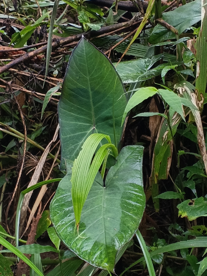 A lush tropical setting showcases large, arrow-shaped leaves. One leaf is dark green with a defined vein structure, while another displays a glossy, lighter shade. A slender, ribbed leaf curls prominently in the foreground. The background features a mix of foliage, including thin blades of grass and decaying plant matter. Overall, the image captures a dense, verdant environment.