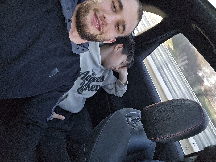 The scene depicts the rear passenger compartment of a vehicle, in the city of Yana, Bulgaria, during daylight. In the foreground, a light-skinned adult male with short dark hair and a beard looks directly at the camera with a slight smile. He is wearing a dark grey hooded sweatshirt and dark trousers, with his left hand resting on his thigh. To his right and slightly behind him, a light-skinned young male, appearing to be a pre-teen or early teenager, is seated. He rests against the car window with his eyes closed, suggesting sleep or repose, and his right hand positioned near his head. He wears a light grey hooded sweatshirt with the text "Angeles Lakers" visible on the chest, and dark trousers. Through the vehicle's rear-side window, a blurred exterior view shows a multi-lane metallic guardrail, bare deciduous trees, and green ground, consistent with a vehicle in motion on a roadway. A black headrest with red stitching, belonging to a front passenger seat, is partially visible on the far right.