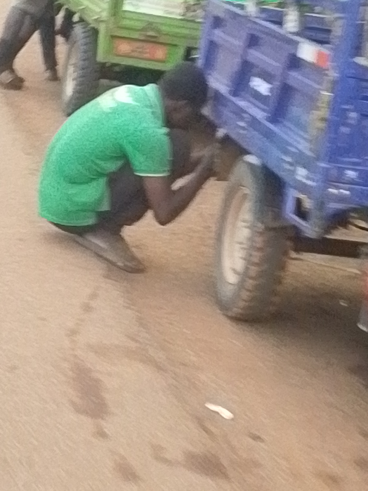 In Tamale, Ghana, a man in a green t-shirt crouches next to a blue cart truck, appearing to work on the wheel