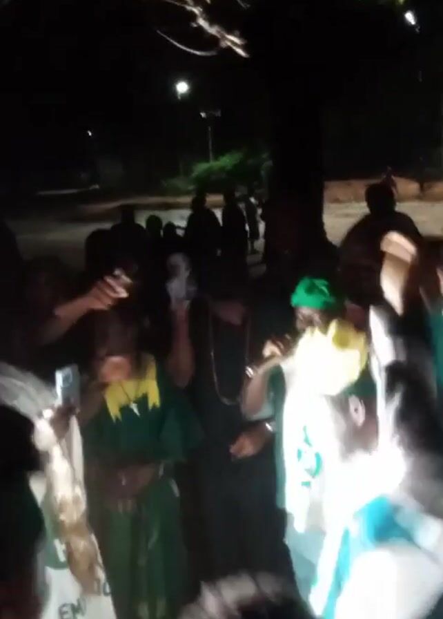 At night, a group of people is dancing and celebrating. Most people are wearing green and white clothing, the colors of the Nigerian flag. In the center, a man with a green cap is holding a microphone, presumably singing or speaking. People are smiling and waving their hands in the air, enjoying themselves. The setting seems to be outdoors, with trees and a street light visible in the background. The lighting is dim, but there's enough light to see the people's movements and expressions.