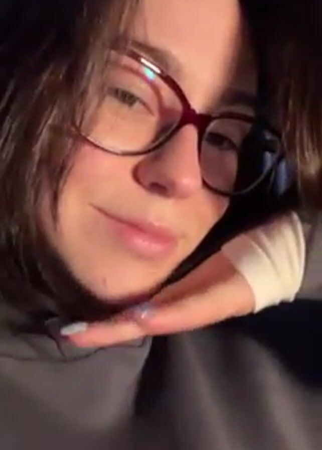 A close-up shot features a woman indoors. She has medium-length dark hair, parted to the side, and wears red-framed glasses. She is wearing a gray sweatshirt. Her left wrist is bandaged, and her fingernails are painted light blue. She rests her head on her left hand, with her eyes closed. In the background, indistinct noises can be heard.