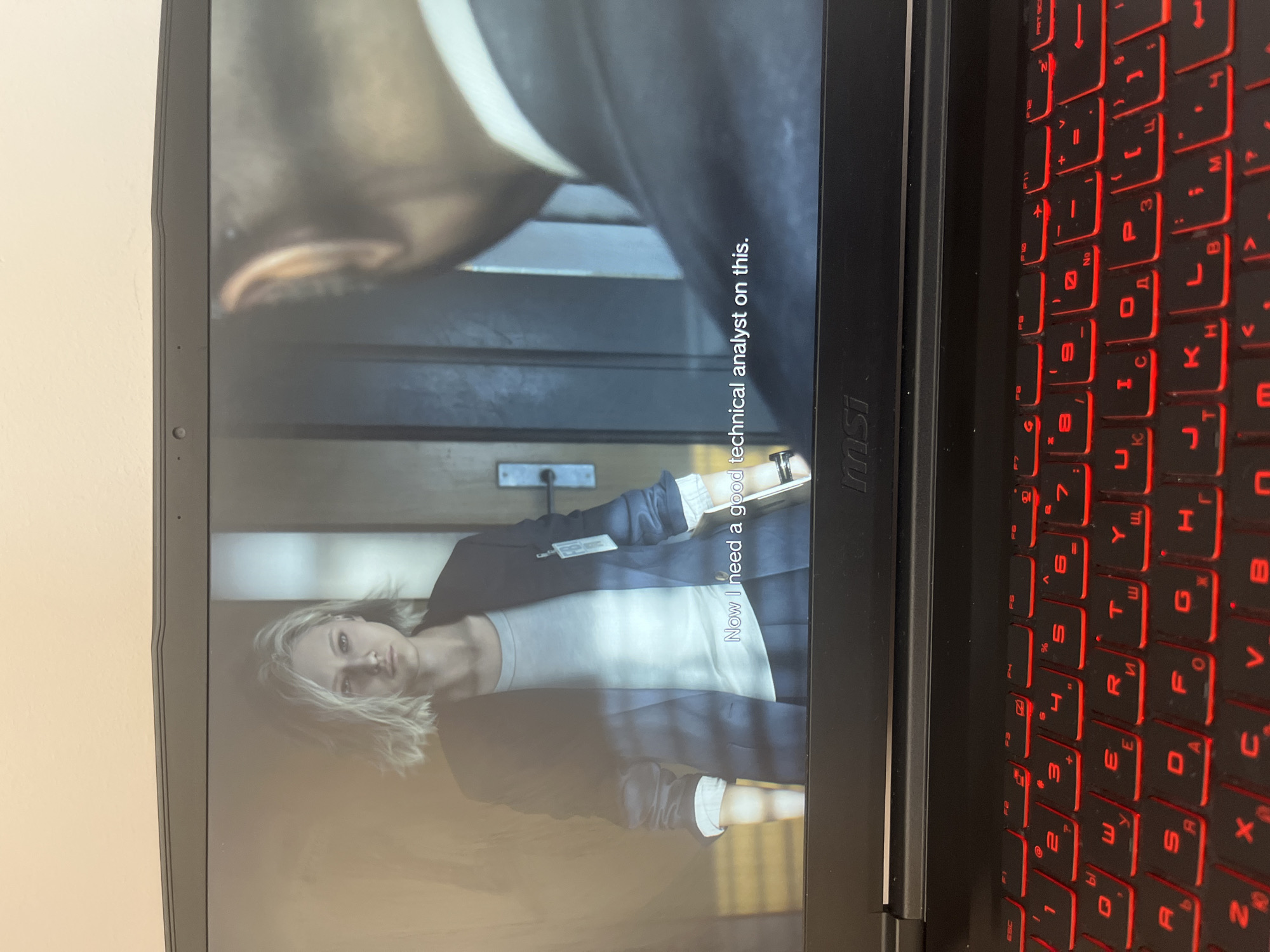 A medium-angle, indoor shot presents a close-up of a laptop screen displaying a scene from a film or television show, specifically featuring a blonde woman in a grey t-shirt and dark blazer. The woman is on the left of the screen, with her head near the bottom left corner, facing towards the right, she is looking directly at the camera. Above her, a man is partially visible, his upper body occupying the upper portion of the screen. Subtitles on the screen read "Now I need a good technical analyst on this." The laptop is an MSI model, visible near the middle right of the screen. To the right of the screen, a portion of the laptop keyboard is visible with its keys illuminated in red, with a keyboard layout in Bulgarian Cyrillic and Latin scripts. The laptop is sitting on a white surface. The image does not provide enough information to know where in Sofia, Bulgaria the laptop is.