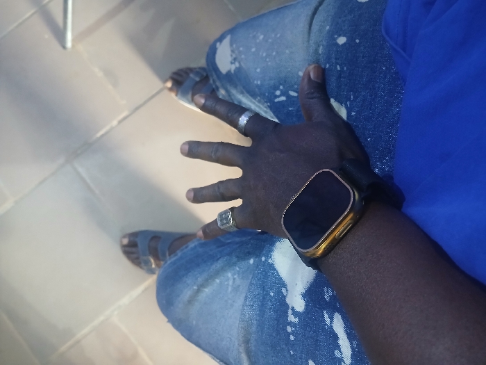 An overhead photograph displays the lower torso, legs, and left hand of an individual, taken in Heany, Zimbabwe. The subject wears blue denim jeans distressed with white paint or bleach splatters, a royal blue garment, and light blue single-strap open-toed sandals. On the left wrist is a smartwatch with a gold-colored rectangular casing and a black band. The left hand is raised with fingers spread, featuring a silver-toned ring on the fourth digit and a gold-toned ring with a dark, rectangular inlay on the fifth digit. The individual is seated, with feet positioned on a light-colored, square-tiled floor. A blurred metallic object is partially visible in the upper right background.