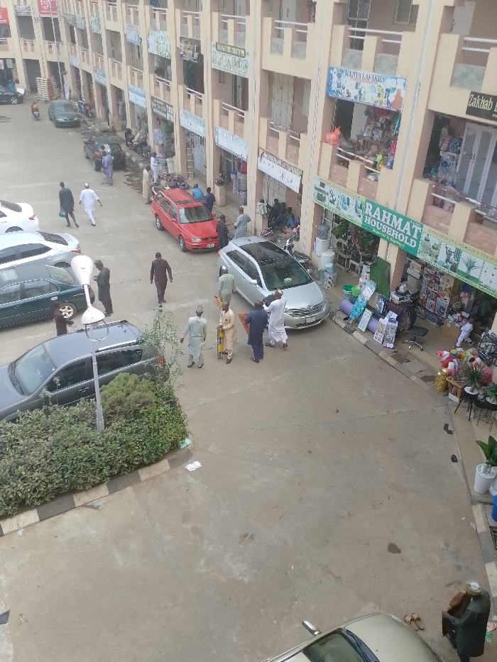 The image depicts an outdoor scene within a multi-story commercial building complex in Maiburiji, Nigeria