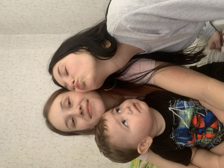 The image depicts three individuals indoors in the city of Фоки, Russia. In the central foreground, a female with light brown hair, appearing to be a young adult, smiles and looks directly at the viewer. To her right, another female, also appearing to be a young adult, with long dark hair, has her eyes closed and lips puckered in a kissing gesture, pressing her cheek against the first female's cheek. She wears a light grey long-sleeved top and a gold-colored hoop earring in her visible ear. An infant male, wearing a black t-shirt featuring a multi-colored graphic design that includes a cityscape and a red and blue spider, is positioned in front of and to the left of the central female. The infant looks upwards and to the left with a neutral expression. The background consists of a light-colored, textured wall. A segment of green fabric is visible on the far left, and light-colored fabric is present in the lower right portion of the frame.