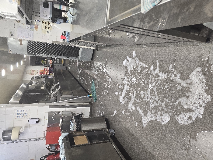 This image depicts the interior of a commercial kitchen located in Mouscron, Belgium. The scene is illuminated by overhead artificial lighting. The floor, composed of dark grey tiles, is extensively covered in a layer of white foamy liquid, consistent with soap suds and water, indicating either a spill or an ongoing cleaning operation. No individuals are visible within the frame. On the left, a white tiled wall features a cream-colored paper towel dispenser and a white wall-mounted soap dispenser. Below these, a red fire extinguisher stands on the floor next to a red rectangular object. Further along, a stainless steel utility sink with a faucet is accompanied by a stainless steel trash receptacle with a black liner. A mobile stainless steel counter is partially visible in the foreground, draped with a light blue and white striped cloth. Extending into the background along this wall is a series of interconnected stainless steel commercial kitchen appliances, possibly fryers or cooking stations. A green mop with a yellow handle lies horizontally on the wet floor in the midground, near this equipment. On the right side of the image, a long stainless steel counter runs parallel to the left wall. On this counter, a white plastic bottle, a light blue towel, a red plastic cup, and a black cup are present. Above the counter, stainless steel shelving units hold a microwave oven and various containers. Adjacent to this, a tall, dark modular shelving unit with multiple slatted trays is visible. Documents and handwritten notes are taped to the vertical surfaces of the equipment or wall in the background. The far background reveals a dimly lit passageway or doorway leading to another area, with additional shelves displaying assorted items.