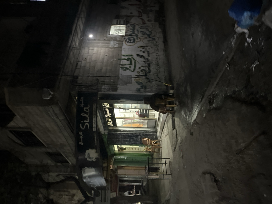 An alleyway at night shows a narrow passage between buildings. One building features graffiti on its upper wall and a sign for "Sila." Shopfronts are visible, illuminated with internal lighting. Chairs are placed outside a shop. The ground is dark and possibly wet, with shadows cast by the low lighting. A person sits in a chair.