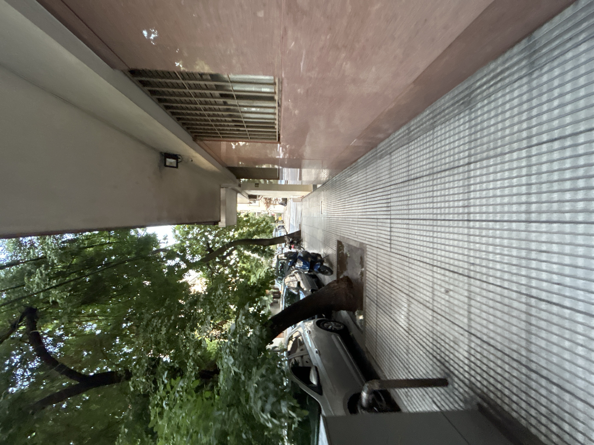 A sidewalk in Buenos Aires, Argentina, is viewed from an elevated perspective, lined by buildings on either side
