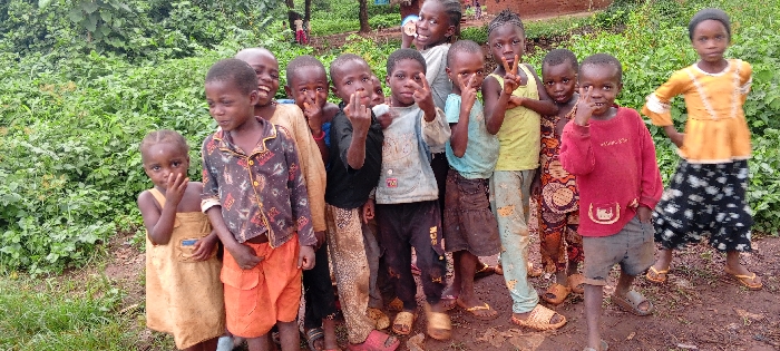 A group of ten African children are posing outside in a rural area. Several children are holding up peace signs. The children are wearing a variety of clothing, including dresses, shirts, and pants. The background consists of green vegetation and dirt. Most of the children are smiling and looking at the camera.