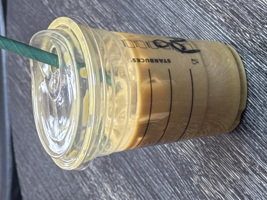- "A transparent plastic Starbucks cup, containing an iced coffee with distinct layers of dark brown coffee and lighter beige-brown liquid mixed with ice cubes, rests on a dark, horizontally textured surface" by FM-gH53j1, licensed under CC BY 4.0