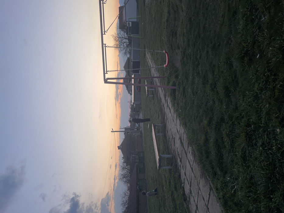 The image depicts an outdoor scene in Hadzhidimitrovo, Bulgaria, during twilight hours. The sky transitions from pale blue overhead to orange and pink hues near the horizon, with scattered dark clouds on the left. In the foreground, a dark green grassy area is bisected by a paved walkway composed of square concrete slabs. A child, dressed in light clothing, is seated on the grass in the lower left, facing away from the camera. In the mid-ground, a dark-clad adult stands upright on the paved walkway, facing away from the camera. Two light-colored wooden benches with metal frames are positioned along the walkway; one is closer to the left, and another is further back to the right. To the right, a metal swing set with pink vertical supports holds a single red swing seat. The background reveals a residential area with several single-story and two-story houses, characterized by tiled roofs and visible walls. Bare trees are scattered among the structures, and utility poles with overhead lines are visible. A narrow road runs through the residential area, and a faint silhouette of mountains or hills can be seen on the distant horizon. No direct interaction between the two individuals is evident.