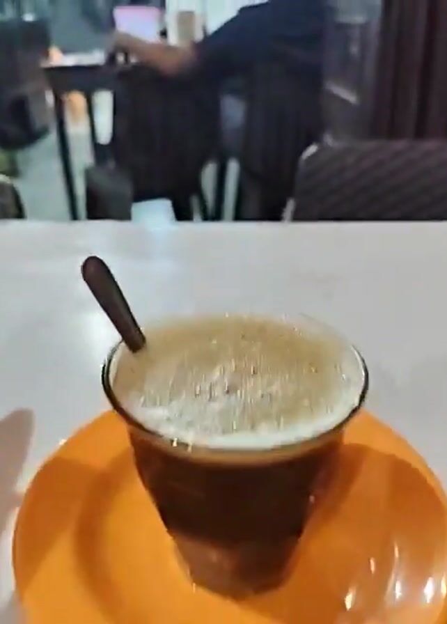 A cup of coffee sits on a white table atop an orange saucer. The coffee is dark with a tan-colored foam at the top. A small spoon is placed inside the cup. In the background, a person is sitting at a table in what appears to be a cafe setting. The video zooms in and out on the cup of coffee.