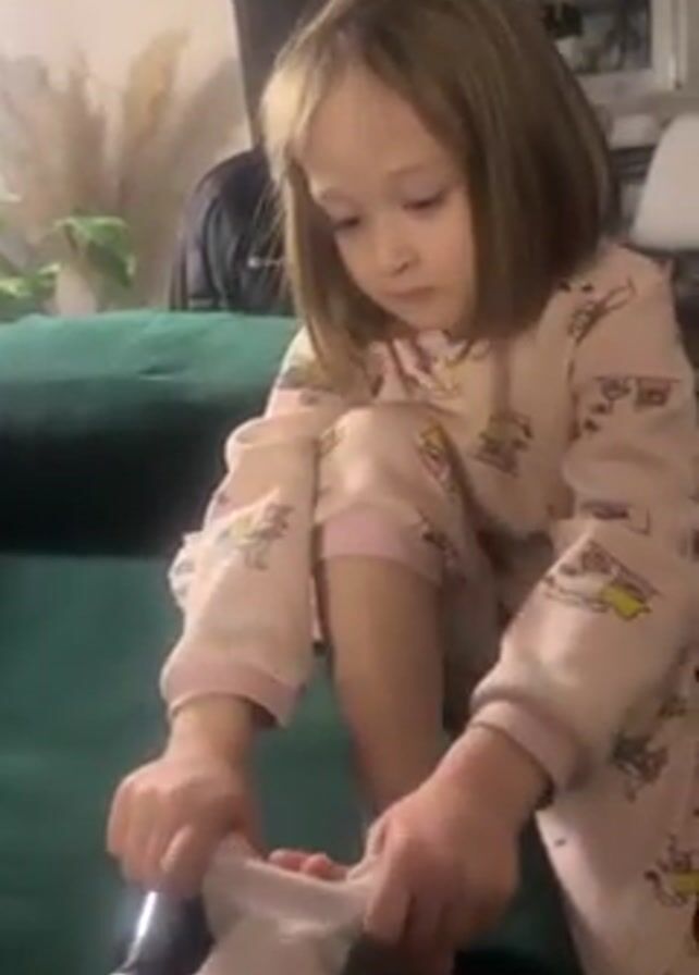 A young girl is putting on a sock