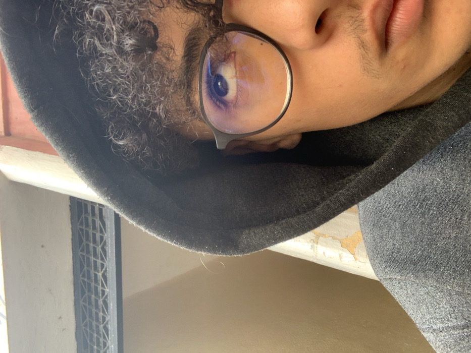 The image captures a close-up, partial view of a male individual. He is wearing a dark grey hooded sweatshirt, with the hood pulled over his head and framing the right side of his face. The subject has dark, curly hair and wears circular-rimmed glasses with dark frames. His right eye is visible, looking upwards, and a distinct blue light reflection is present on the lens. A faint moustache is visible above his upper lip. The background features a vertical support structure to the left, painted white with significant peeling, revealing a beige layer underneath. Above this, a horizontal dark grate with a geometric pattern is visible, situated below a plain beige wall or ceiling. A narrow strip of a reddish-brown wall is discernible at the top right edge. The specific location within Casablanca, Morocco, is not identifiable from the visual evidence presented.