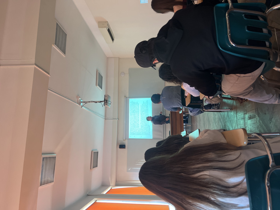 This image depicts a classroom in Yerevan, Armenia, during a lecture or presentation