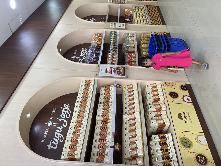 A young girl in a pink dress stands next to a blue shopping cart in a bakery store. Shelves display stacks of "Bakpia Kukus Tugu Jogja" packaged cookies, labeled "Best Seller." Signs indicate "PIE Blangkon" and prices. The girl peeks out from behind the cart, her gaze directed towards the viewer. The store's interior is brightly lit, with wooden shelves and tiled floors.