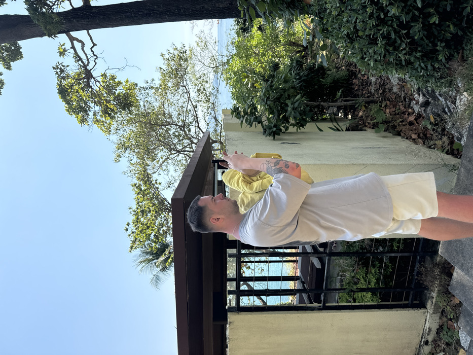 A man in a gray t-shirt and light shorts holds a baby in a yellow outfit. They stand outside near a building, with lush green trees and a blue sky in the background. The area appears to be near water, visible through a black metal railing. The man's arm has a tattoo. The scene has a natural, bright daylight.