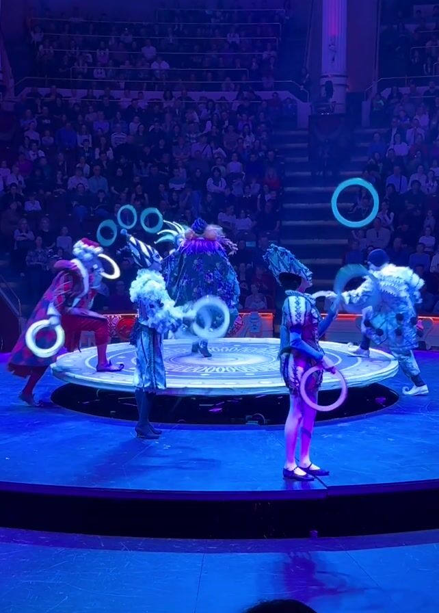 The video depicts a group of performers in a circus setting. There are six performers on a circular stage, each dressed in brightly colored, elaborate costumes. They are juggling multiple white rings, which appear to be illuminated with a blue light. The background reveals a large audience seated in tiered rows, watching the performance. The stage is bathed in blue light, with overhead spotlights adding to the visual spectacle. A white column stands in the background, adding to the circus-like atmosphere.