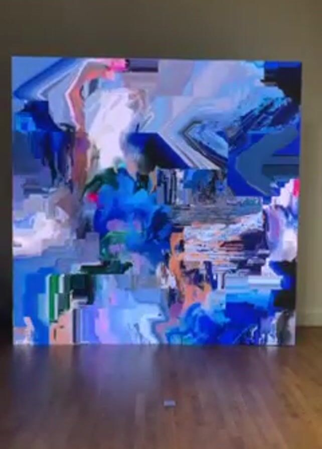 The camera faces a large square artwork resting on the floor. The piece is filled with distorted blocks of blue, pink, purple, and white. The floor is made of wood. The wall is white.