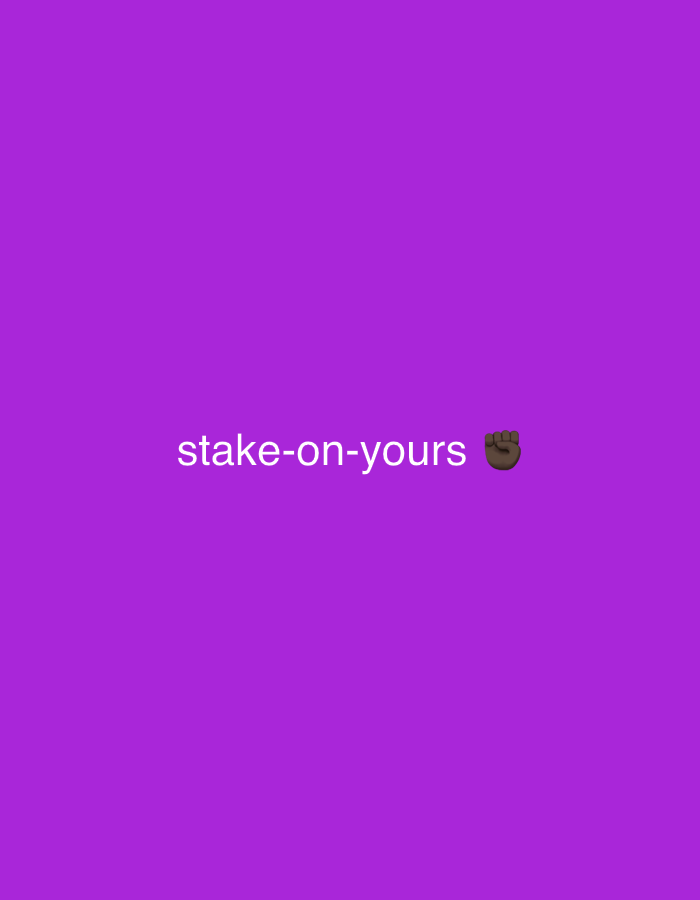 A solid purple background displays the white text "stake-on-yours" accompanied by a dark-skinned fist emoji