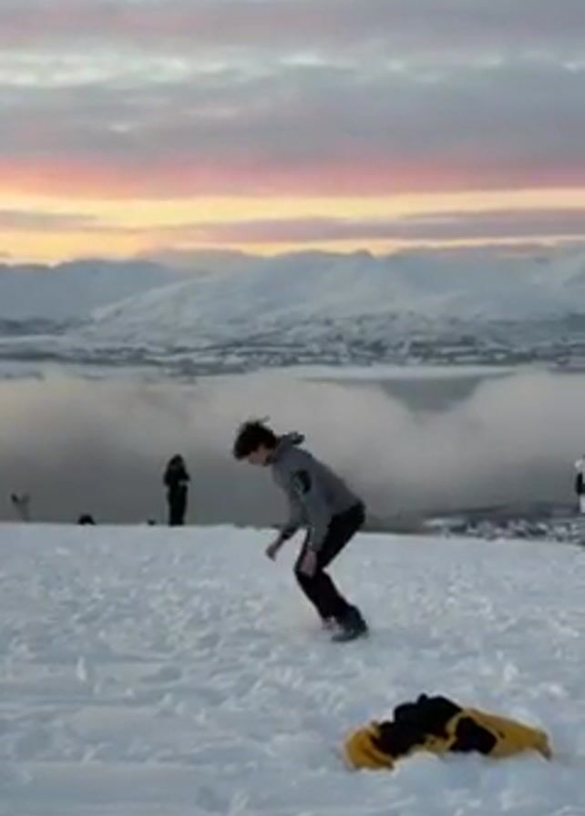 young man doing a backflip on a snow-covered hill, with a scenic background of snow-capped mountains and a sky painted with the colors of a sunset. The man is dressed in a gray jacket and black pants. In the foreground, there is a yellow jacket lying on the snow. In the background, other people can be seen standing and enjoying the view. After landing the backflip, the man smiles and spreads his arms out.