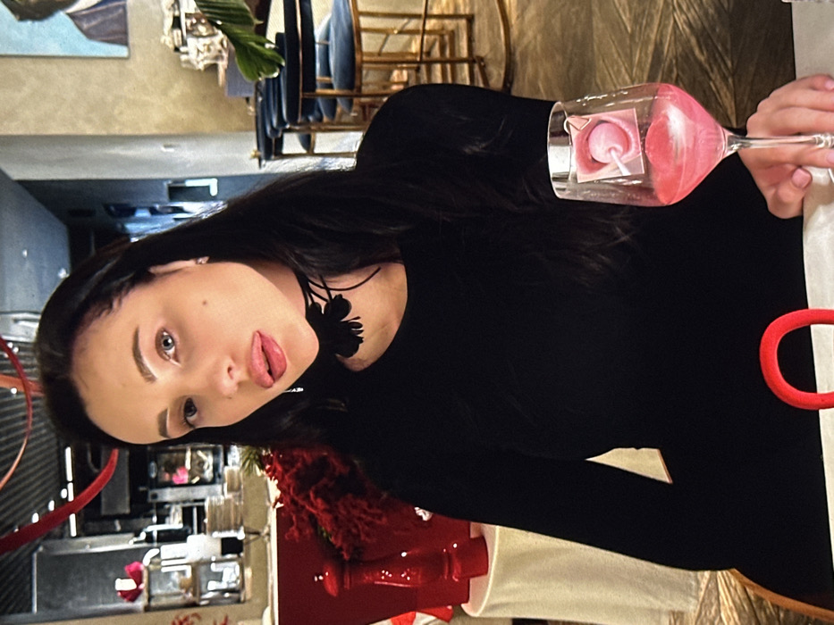 An adult female is seated at a table in an indoor restaurant or bar located in Novoe Devyatkino, Russia. She has long, dark hair and is wearing a long-sleeved black top or dress, accented with a black choker featuring a floral or leaf-like embellishment. Small stud earrings are visible. Her lips are slightly parted, and she looks directly at the camera. Her left eyebrow shows a distinct scar or gap. On the white-clothed table in front of her, a clear wine glass contains a pink, shimmery liquid with ice and a small square tag depicting a pink lollipop and lips clipped to its rim. Her left hand, with light pink polished nails, holds the stem of this glass. A red, U-shaped object is partially visible on the table to the left. In the background, to the left, a large red, ribbed object and a cluster of red foliage are on a table. Further back, stacked plates and kitchen equipment are dimly visible. Red decorative elements hang from the ceiling. To the right, several bar stools with blue velvet seats and gold-colored frames are arranged. A plant with large green leaves and a framed portrait on a light-colored wall are also present. The ceiling features exposed dark-colored elements.