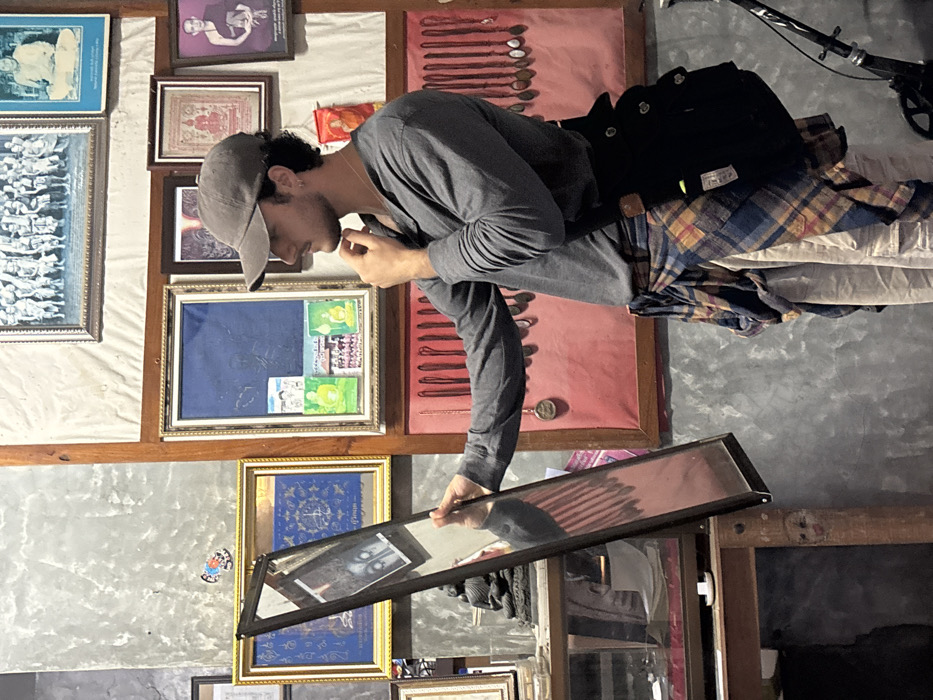 Inside a detailed establishment in Pai, Thailand, a male subject is observed from the mid-torso upward, positioned facing right in profile