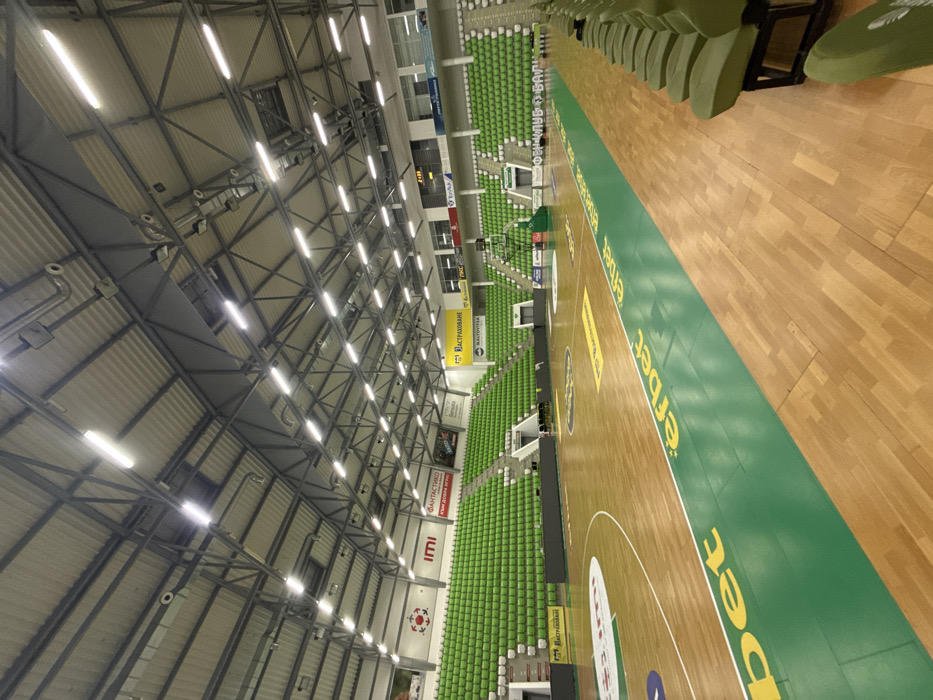 - "An indoor basketball arena, identified as Arena Botevgrad in Botevgrad, Bulgaria, is depicted from a low angle, looking across a polished light-colored wooden court towards tiered spectator seating" by FM-w6ocp1, licensed under CC BY 4.0