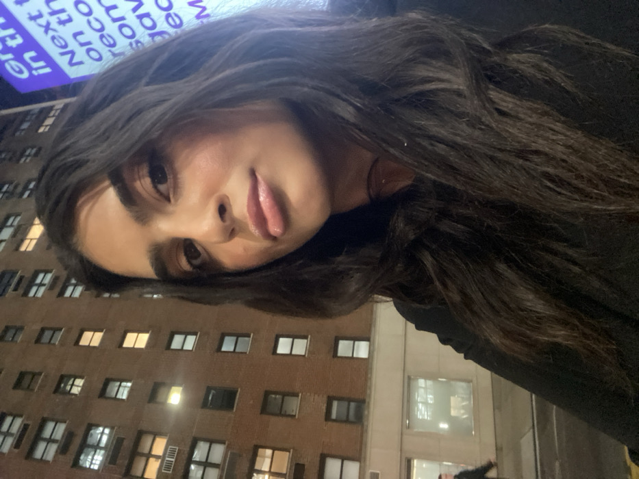 A woman with long, dark hair and brown eyes poses for a selfie against a backdrop of a brick building with numerous lit windows at night