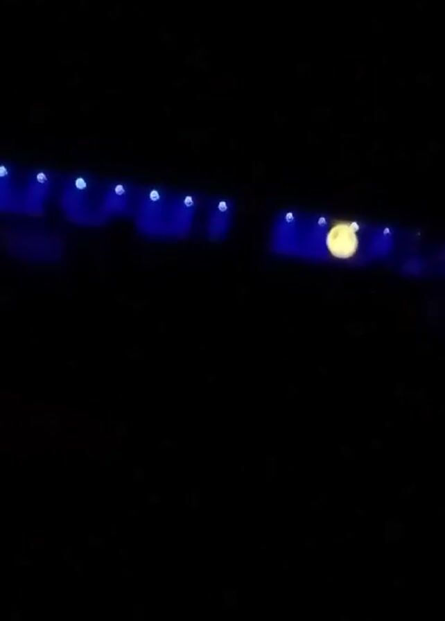 A dark, grainy video shows a structure outlined with blue lights at night. The lights appear to be arranged in a row along the top edge of the structure, with one yellow light visible amongst them. Below, there is a blurry, white reflection or illumination. The camera shakes slightly, and the focus shifts in and out. A "TECNNO" watermark is visible in the bottom left corner of the screen. The overall scene is dark and difficult to discern.