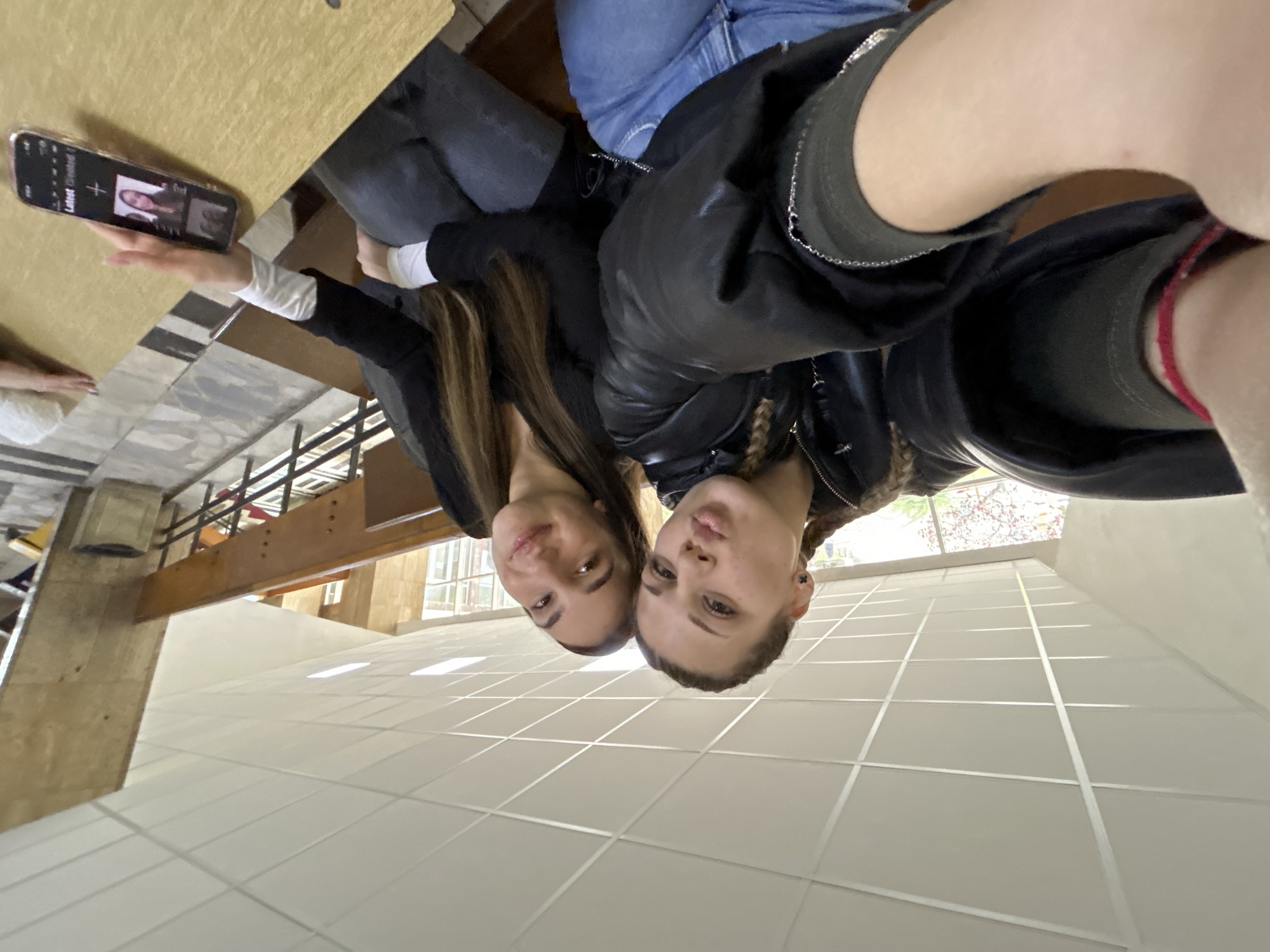Two young women pose for a selfie. One woman holds a smartphone while seated at a table. The photograph shows an interior featuring white tiled walls and a wooden beam structure. The location is likely in Sofia, Bulgaria, given the architectural style and the presence of Eastern European features.