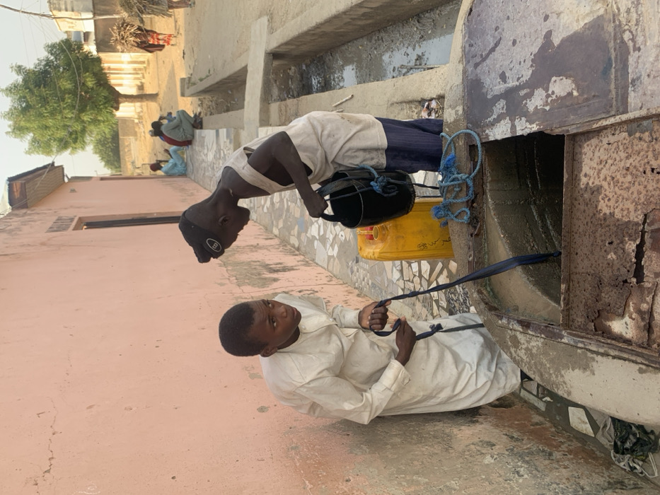 - "An outdoor scene in Dabawa, Nigeria, depicts two young males drawing water from a well adjacent to a faded peach-colored building wall" by FM-eD8PP2, licensed under CC BY 4.0