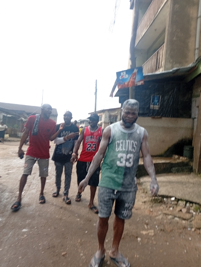 This image captures a daytime street scene in Aba, Nigeria, featuring five dark-skinned males on an unpaved road under an overcast sky. In the foreground, a male, appearing to be in his 20s or 30s, is covered extensively in a white powdery substance on his face, hair, and exposed arms. He wears a green and grey sleeveless basketball jersey with "CELTICS 33" printed on the front, grey patterned shorts, and dark flip-flops. He walks towards the viewer, looking directly into the camera with a neutral expression. Behind him, to the left, four other males are present. One wears a red t-shirt, light-colored shorts, and dark flip-flops, holding a dark object, possibly a mobile phone, in his left hand. Adjacent to him, a male in a dark t-shirt, dark trousers, and dark flip-flops is partially obscured. Further back, another male wears a red sleeveless basketball jersey with "BULLS 23" printed on it, dark shorts, and dark flip-flops. A fifth individual is partially visible behind the group. The immediate environment consists of a dirt or gravel road with visible debris. To the right, a multi-story concrete building with balconies shows signs of wear and age. An "ICE COLD" sign, likely for a beverage advertisement, is mounted on this building. A utility pole with overhead wires is also visible. The ground floor of the building is partially obscured by a dark tarpaulin. The presence of the white powder suggests the individual in the foreground is participating in a celebratory or ritualistic event.