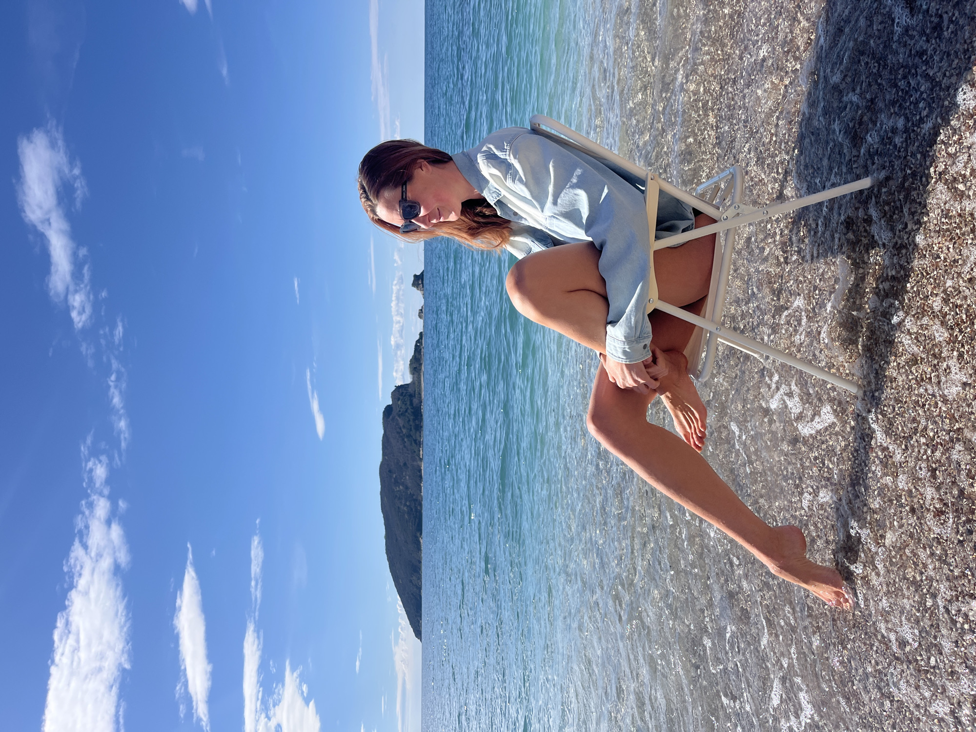 A woman is sitting in a white folding chair at the edge of the water at the beach in Budva, Montenegro. She is wearing sunglasses and a light-wash denim shirt. The water is clear and shallow, with small pebbles visible beneath the surface. A small, rocky island is visible in the distance. The sky is blue with scattered clouds.