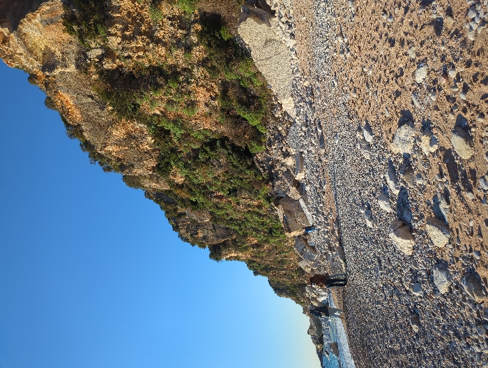 The scene depicts a coastal area in Perazića Do, Montenegro, under a clear, bright blue sky. A steep, rugged cliff face, composed of yellowish-brown rock with extensive green vegetation and scattered trees, occupies the right side of the frame, extending into the distance on the left. The foreground features a wide beach comprising predominantly grey and white pebbles, intermixed with areas of light brown sand. Several large, angular pieces of light-colored debris, consistent with rockfall or concrete fragments, are scattered at the base of the cliff on the right. The Adriatic Sea is visible along the left edge, displaying calm, light blue-green water near the shore. Three individuals are present on the beach. Two individuals stand near the waterline on the left side, facing away from the camera; one wears dark clothing, and the other wears a brown jacket. A third individual, positioned further up the beach towards the cliff base in the mid-ground, is observed wearing blue attire. The environment is illuminated by natural sunlight, casting visible shadows.