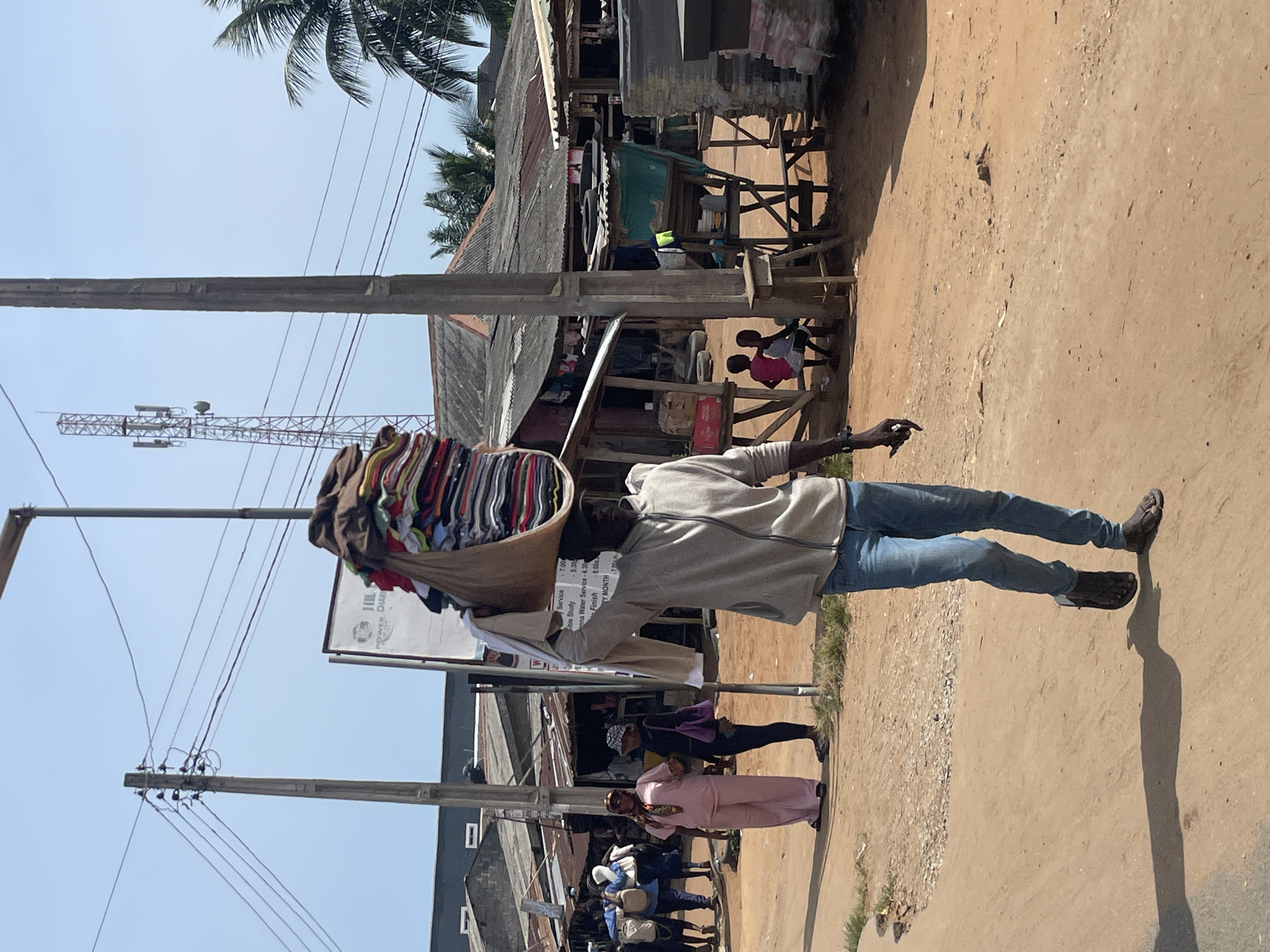 man in Ikoga, Nigeria, balancing a large bundle of clothing on his head while walking on a dirt road. He is wearing a gray sweatshirt and blue jeans. In the background are buildings with corrugated metal roofs, utility poles and power lines, a cell phone tower, and other people. One sign reads "Power Char." Two children are sitting on the corner of a wooden structure. A woman in a pink outfit walks in the opposite direction.