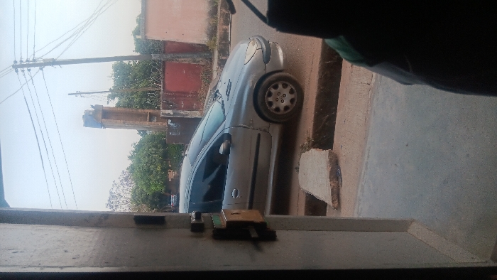 The image displays an outdoor street scene in Jos, Nigeria, captured from an indoor vantage point through an open doorway. The left foreground shows part of a light-colored wooden doorframe with a brown, rectangular object, possibly an electricity meter or lock unit, affixed to it. A silver Peugeot 206 hatchback, featuring tinted windows and visible damage to its front driver-side panel, is parked on the right side of a paved road. A concrete curb separates the road from a dirt and gravel shoulder, where a broken concrete slab lies. In the background, a red-painted wall topped with barbed wire runs parallel to the road, with green foliage from trees visible behind it. To the right of this wall, a light-colored building facade is partially seen. Further back, a tall, narrow, light-brown structure, potentially a water tower, with a blue tank on its summit, stands against a hazy sky. Overhead, several electrical wires span the frame, supported by a dark utility pole on the right. Another vehicle is faintly discernible further down the road in the distance. No individuals are visible.
