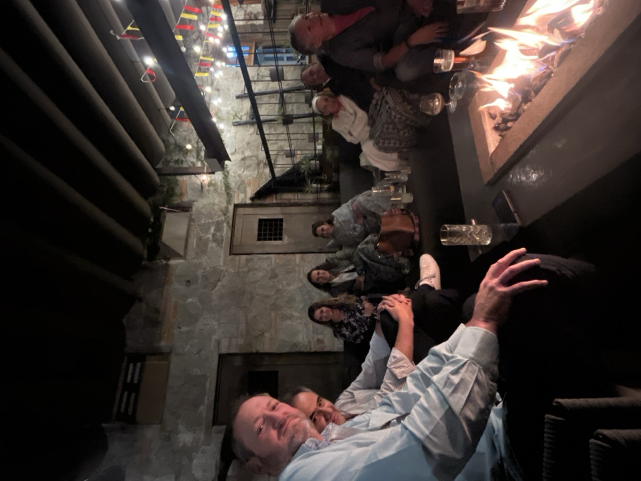 n outdoor evening gathering of approximately nine individuals seated around a rectangular fire pit on a patio or courtyard in Domingo Arenas, Mexico
