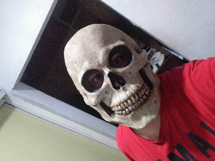 A single individual is depicted indoors in Ciherang, Indonesia. The subject is wearing a light-colored, full-face plastic or rubber skeleton mask, featuring hollow eye sockets, a prominent nasal cavity, and an articulated jaw with exposed teeth. The subject's dark eyes are visible through the mask's eye openings, directed forward. A red, short-sleeved t-shirt is worn, with partial dark lettering, possibly "MAJ" or "MAL", visible on the left chest area. The background primarily consists of a light-colored wall, likely white or very light beige, and a dark, recessed opening, possibly a doorway or alcove, framed by light-colored trim. Within this dark recess, to the subject's right, a pair of white athletic shoes with green accents and another dark-colored shoe are visible resting on a surface. The image is captured with a slight upward tilt.