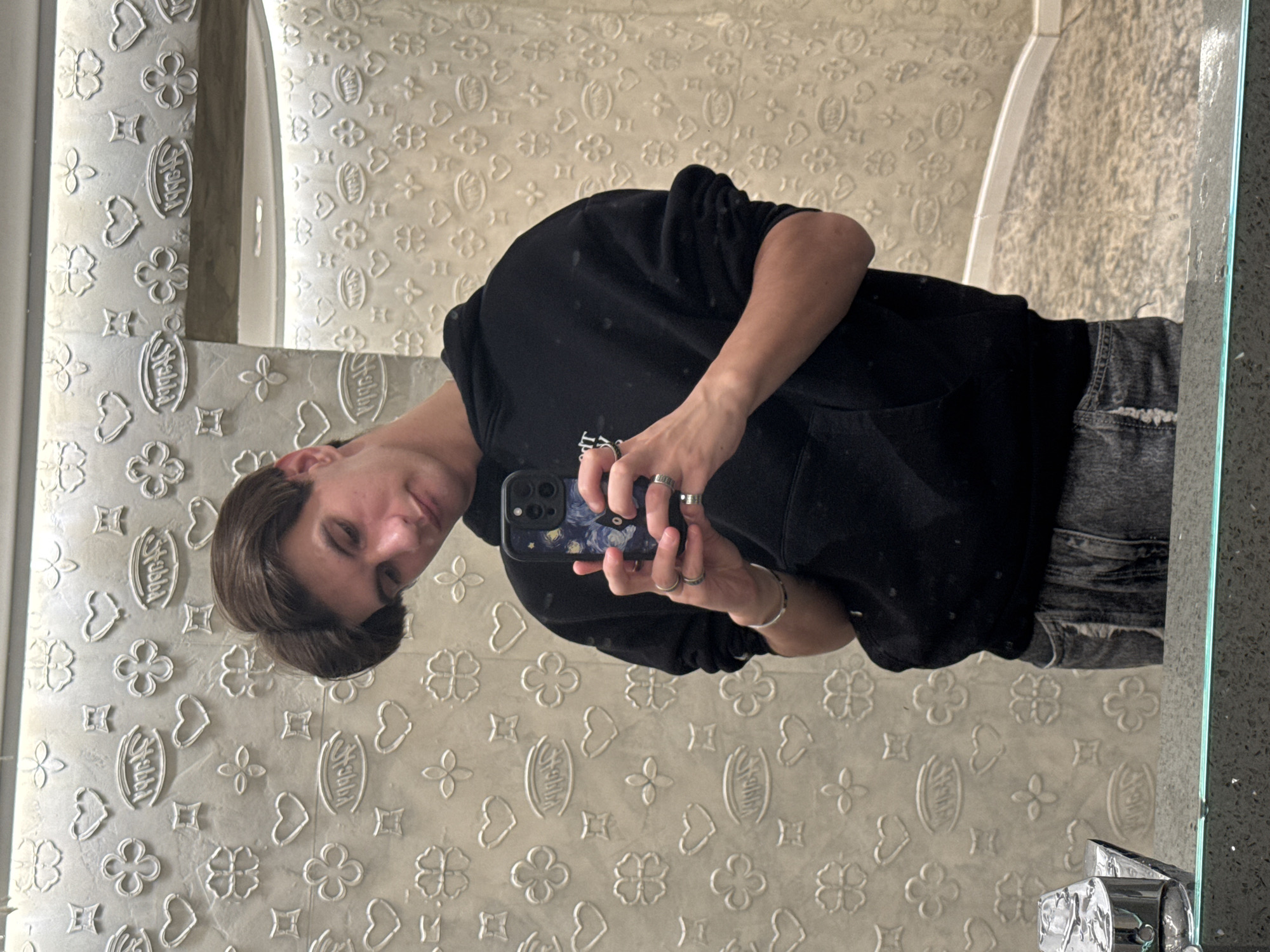 A young person is seen in a mirror selfie. They are wearing a black hooded sweatshirt and distressed grey jeans. The background features a patterned wall. The location is not identifiable as Sofia, Bulgaria based on the image.