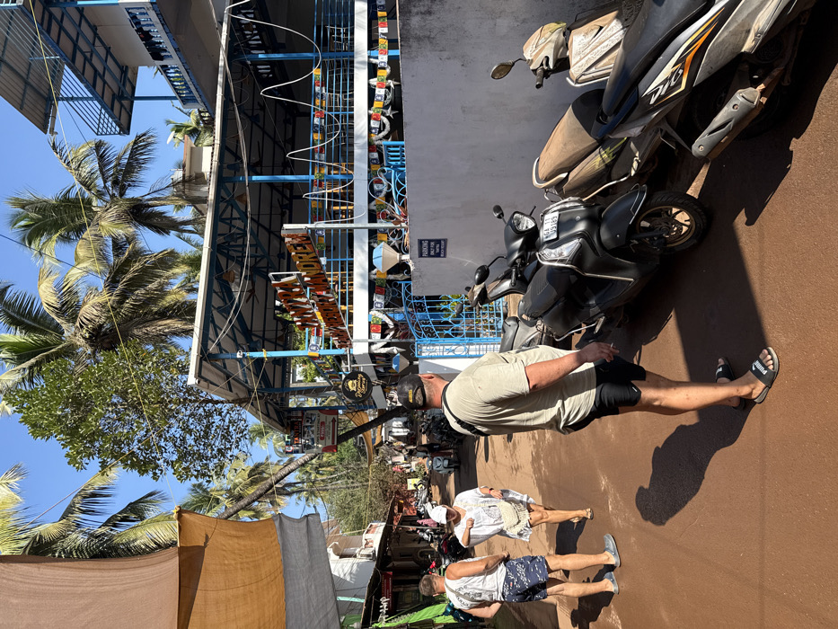 A sunlit street scene depicts two motorbikes parked near a building with a blue and white structure above. A man in a light shirt and black shorts walks nearby. Further down the street, two other people are visible. Palm trees and other vegetation fill the background, with awnings and buildings lining the sides of the street. The image is taken at an unusual angle, with the perspective slightly tilted.