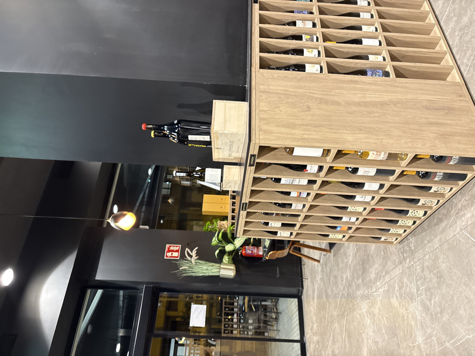 A well-lit wine shop features a tall, wooden wine rack, filled with bottles in neat rows