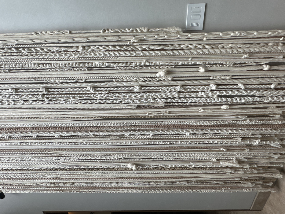 The image displays a floor-to-ceiling textile art piece in an indoor setting. The artwork is composed of numerous vertical strands of varying textures, including plain cords, braided sections, twisted ropes, and regularly spaced knots. The strands are primarily in shades of off-white, cream, beige, and light brown. The textile occupies the majority of the frame, obscuring the wall directly behind it, and extends from an unseen mounting fixture at the top to the floor where the strands appear frayed. To the right of the textile, a plain light gray wall is visible, featuring a white triple-gang electrical rocker switch plate. To the left, a dark brown vertical architectural element, possibly a doorframe or trim, is partially visible, receding into a darker area. The floor beneath the textile and along the wall appears to be light-colored tile with a visible reddish-brown baseboard or trim. No people are present. The specific location within Monterrey, Mexico, is not identifiable from the visual information.